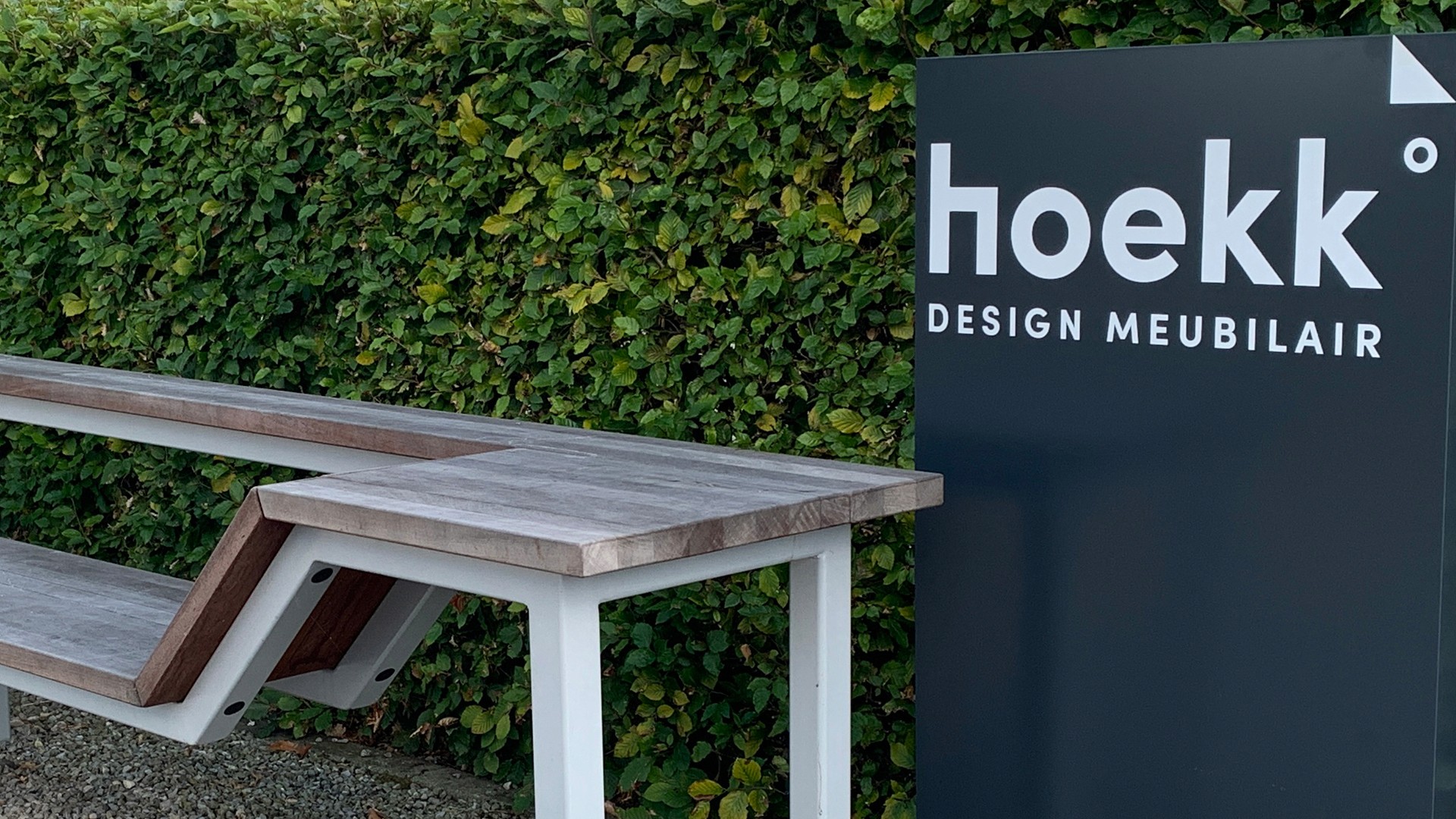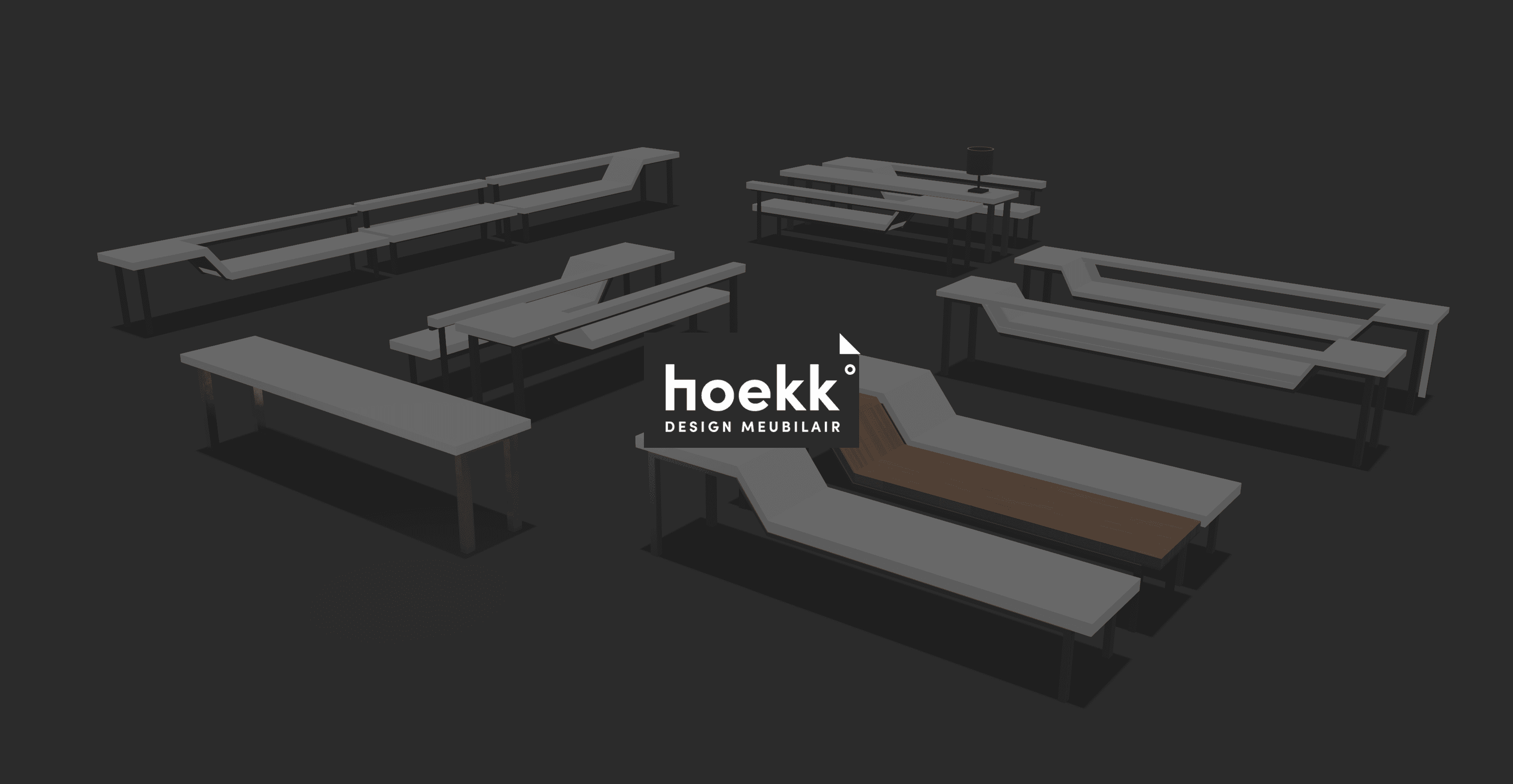 I created "Hoekk" as a distinctively Dutch-sounding name referencing the corner ("hoek") elements central to the design. The minimalist logotype features a square element in the upper right, echoing the furniture's modular nature and establishing a recognizable mark across applications.