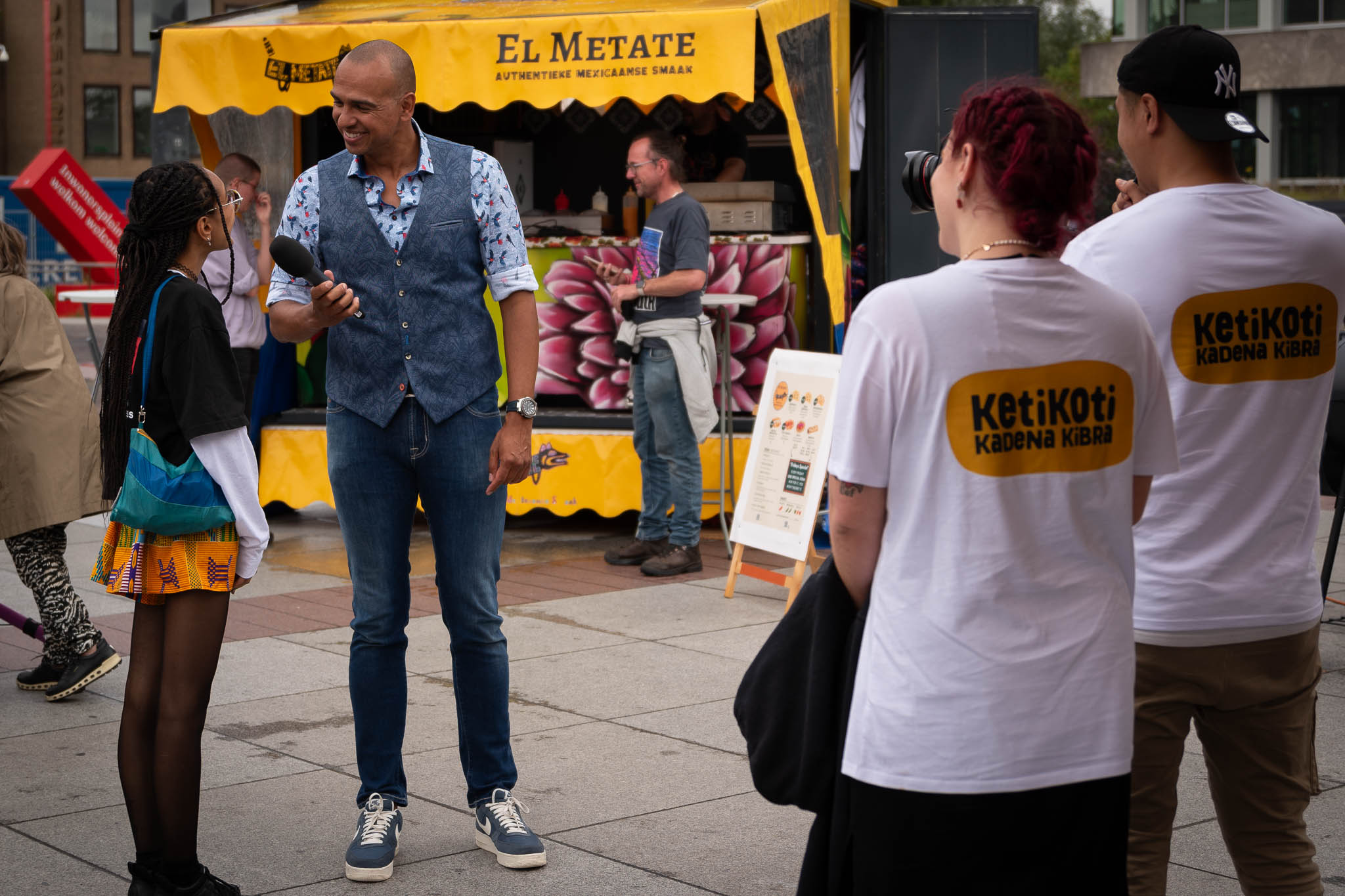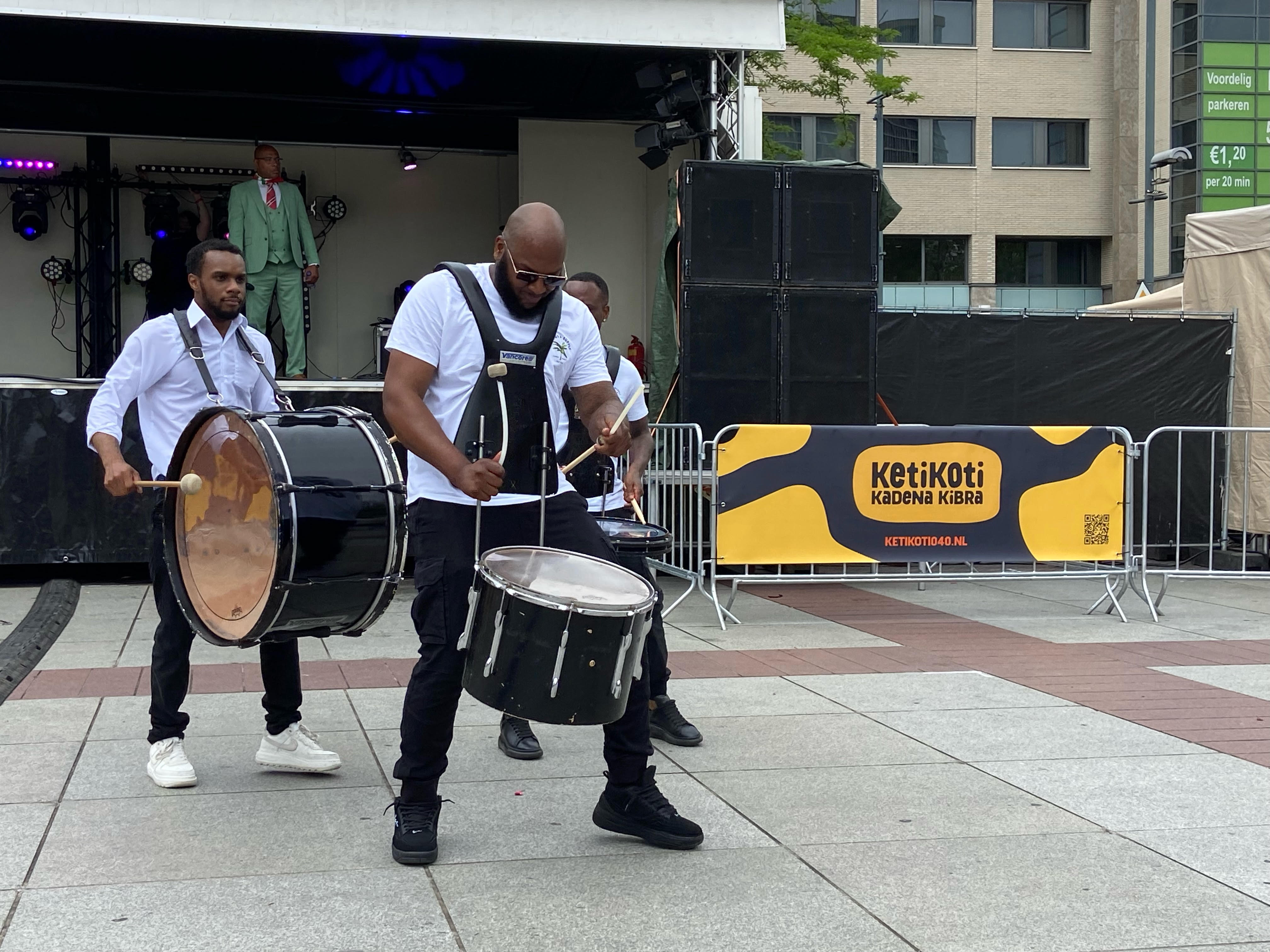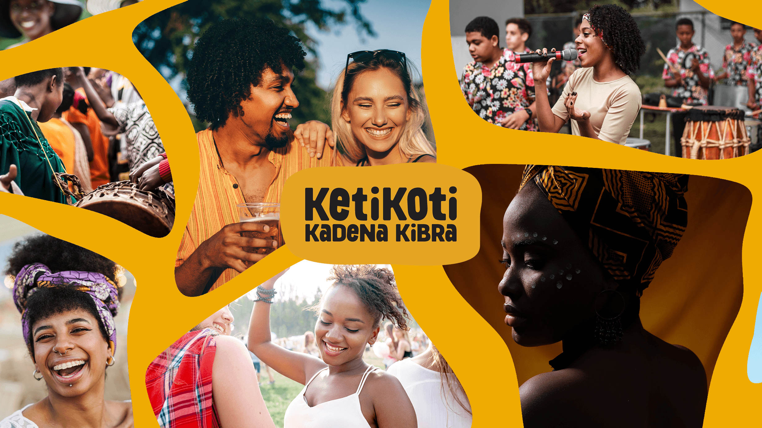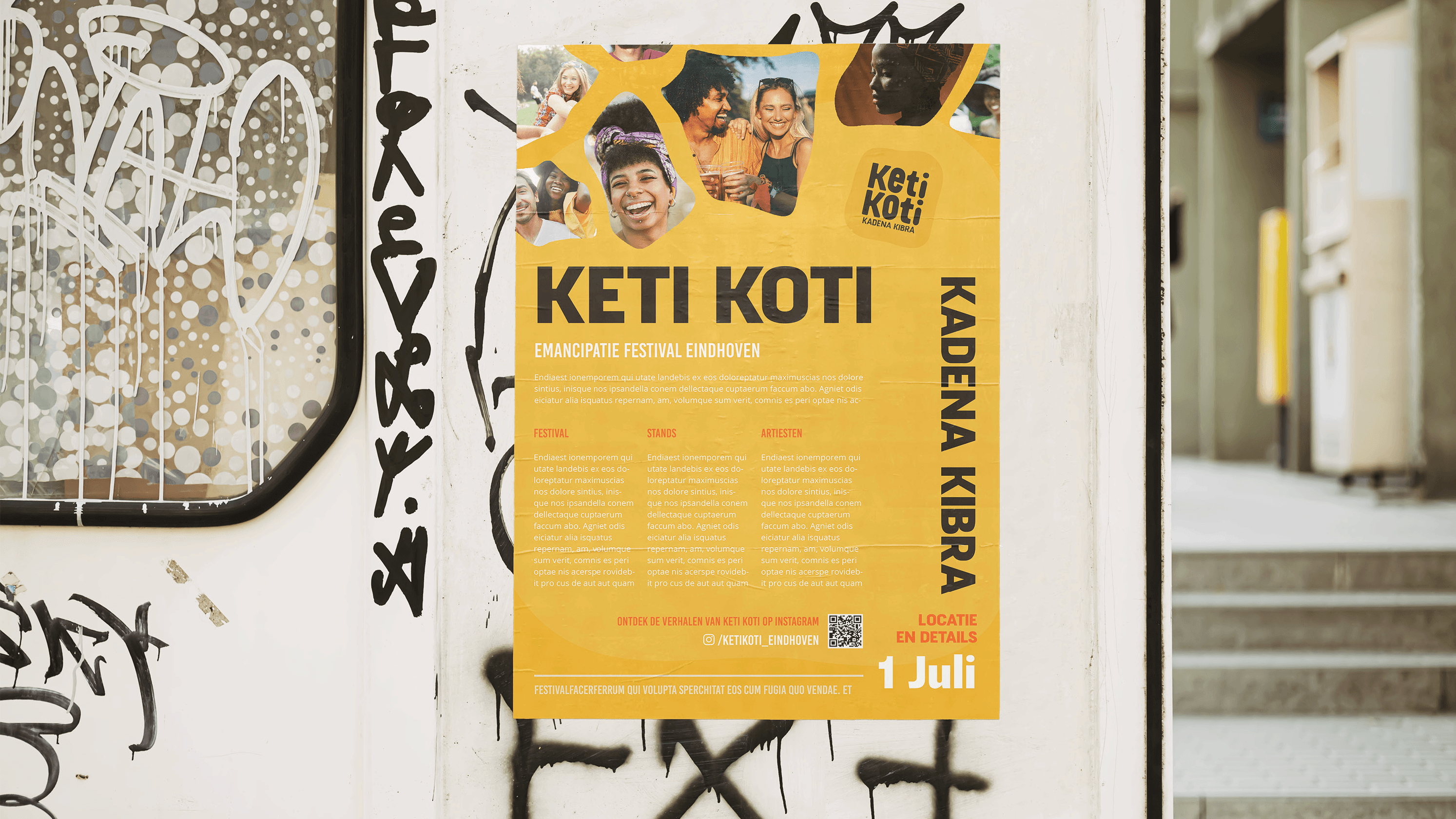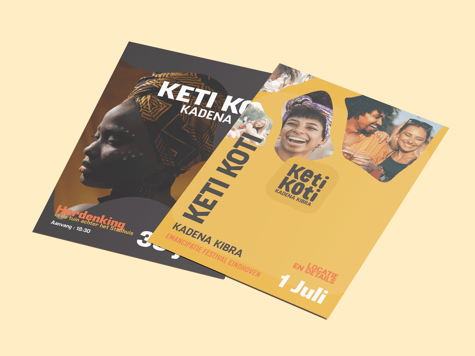I designed a distinctive logotype for "Keti Koti Kadena Kibra" within a rounded yellow container, creating a recognizable brand element across applications. The system included posters, programs, social media templates, digital advertising, and merchandise.